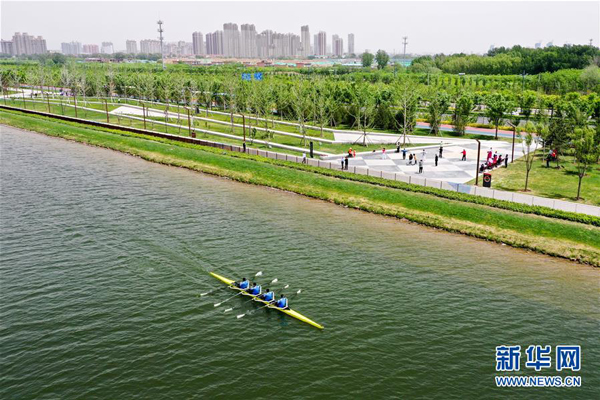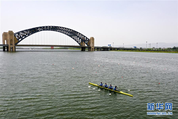 这是山西皮划艇队的队员在汾河太原城区晋阳桥段水面上训练(5月12日摄,无人机照片)。新华社记者 曹阳 摄