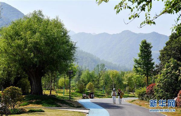 市民在陕西西安市长安区秦岭违建别墅“群贤别业”拆除后建设的秦岭和谐森林公园内散步(4月24日摄)。新华社记者 刘潇 摄