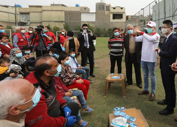 3月16日,在伊拉克巴格达,中国医疗专家展示科学的洗手方法。 新华社发(哈利勒·达伍德 摄)