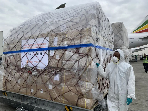 3月22日,用于支援非洲54国抗击疫情的中国援助物资运抵埃塞俄比亚首都亚的斯亚贝巴国际机场。新华社记者王守宝 摄