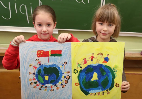 2月27日,在白俄罗斯首都明斯克,两名小学生展示自己支持中国抗击新冠肺炎疫情的绘画作品。新华社发(任科夫 摄)