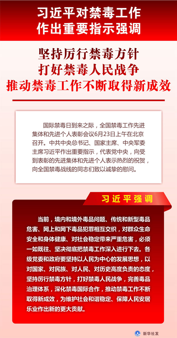 习近平强调,当前,境内和境外毒品问题、传统和新型毒品危害、网上和网下毒品犯罪相互交织,对群众生命安全和身体健康、对社会稳定带来严重危害,必须一如既往、坚决彻底把禁毒工作深入进行下去。各级党委和政府要坚持以人民为中心的发展思想,以对国家、对民族、对人民、对历史高度负责的态度,坚持厉行禁毒方针,打好禁毒人民战争,完善毒品治理体系,深化禁毒国际合作,推动禁毒工作不断取得新成效,为维护社会和谐稳定、保障人民安居乐业作出新的更大贡献。