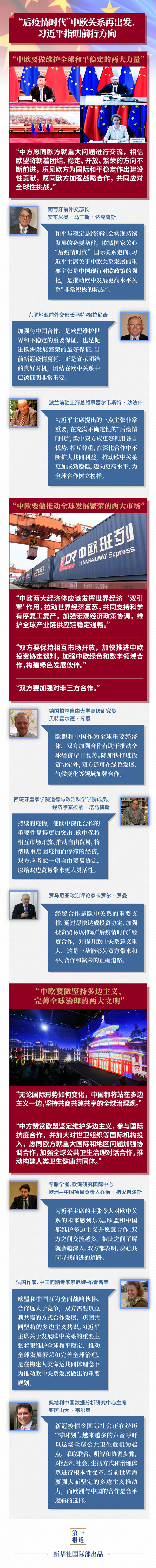 在危机中育新机,于变局中开新局。如何推动“后疫情时代”中欧关系迈向更高水平,打造更具世界影响力的中欧全面战略伙伴关系?习主席指明前行方向: