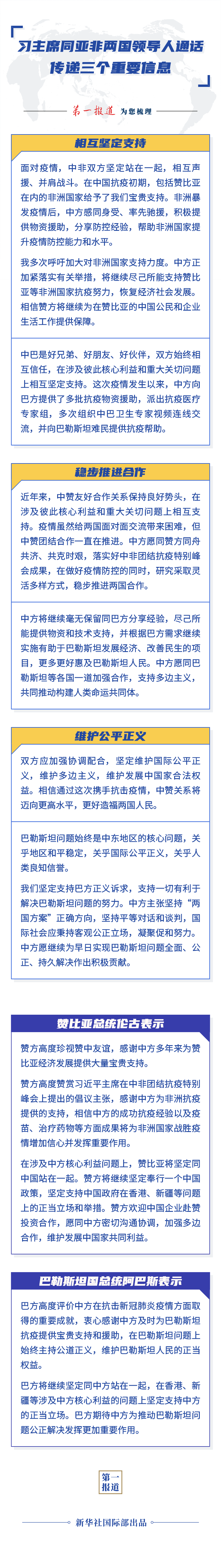 习近平强调,近年来,中赞友好合作关系保持良好势头,在涉及彼此核心利益和重大关切问题上相互支持。疫情虽然给两国面对面交流带来困难,但中赞团结合作一直在推进。中方愿同赞方同舟共济、共克时艰,落实好中非团结抗疫特别峰会成果,在做好疫情防控的同时,研究采取灵活多样方式,稳步推进两国合作。双方应加强协调配合,坚定维护国际公平正义,维护多边主义,维护发展中国家合法权益。相信通过这次携手抗击疫情,中赞关系将迈向更高水平,更好造福两国人民。