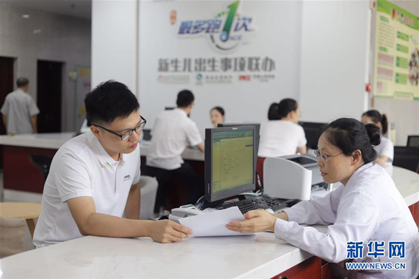 市民在温州瑞安市人民医院(万松院区)办理“新生儿出生事项联办”事项(2019年7月26日摄)。 新华社发