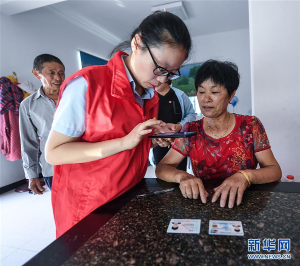 党员志愿者到浙江省长兴县和平镇横山村64岁的残疾人罗伯英(右)家中,为她上门办理老年人乘车优待证(2019年7月23日摄)。 新华社记者 徐昱 摄