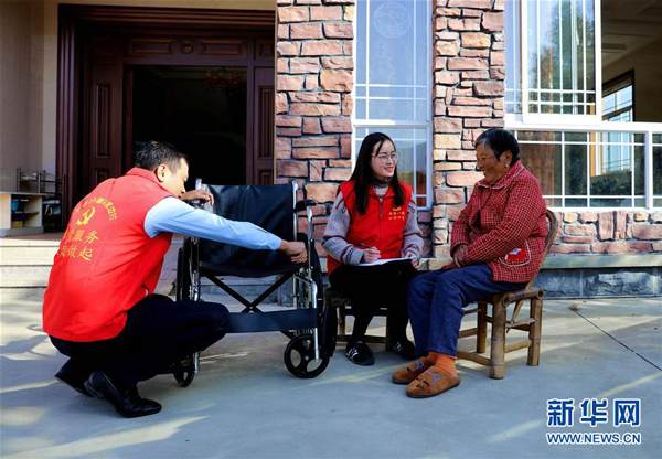 浙江省长兴县和平镇马家边村便民服务中心的志愿者们上门为残疾老人马雪花(右一)办理残疾证换证服务,并且为她送去了新轮椅(2019年11月20日)。 新华社记者 徐昱 摄