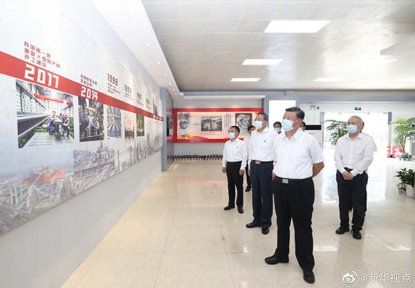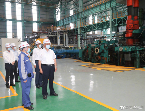 19日上午,正在安徽考察调研的习近平总书记走进中国宝武马钢集团优质合金棒材车间,冒着高温察看生产运行情况,并同劳动模范、工人代表亲切交流。习近平指出,在抗击新冠肺炎疫情过程中,马钢较早复工复产,实现了产量、营销收入同比双升,展现了国有经济的强大韧性。他勉励马钢在长三角一体化发展中把握机遇、顺势而上,特别是要把自身改革发展同长三角一体化发展有机结合衔接,力争在长三角一体化发展中不断发展壮大自己,也为长三角一体化发展作出自己的贡献。(文字记者:张晓松 摄影记者:鞠鹏 王晔 燕雁)