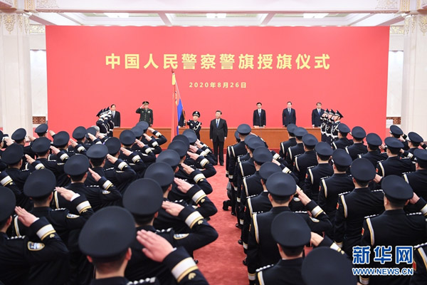 8月26日,中国人民警察警旗授旗仪式在人民大会堂举行。中共中央总书记、国家主席、中央军委主席习近平向中国人民警察队伍授旗并致训词。 新华社记者 张领 摄