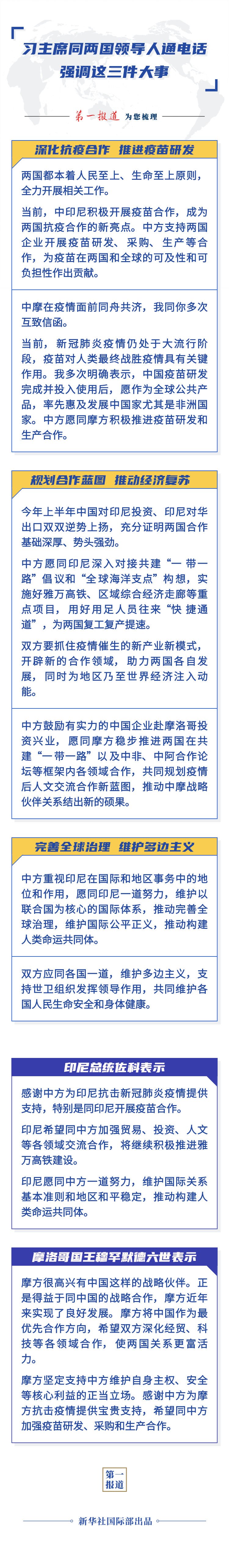 习近平强调,印尼是中国的友好邻邦和重要伙伴,中方高度重视印尼在疫苗合作方面的关切和需求。当前,中印尼积极开展疫苗合作,成为两国抗疫合作的新亮点。中方支持两国企业开展疫苗研发、采购、生产等合作,为疫苗在两国和全球的可及性和可负担性作出贡献。双方要继续团结抗疫,共同推动构建人类卫生健康共同体。