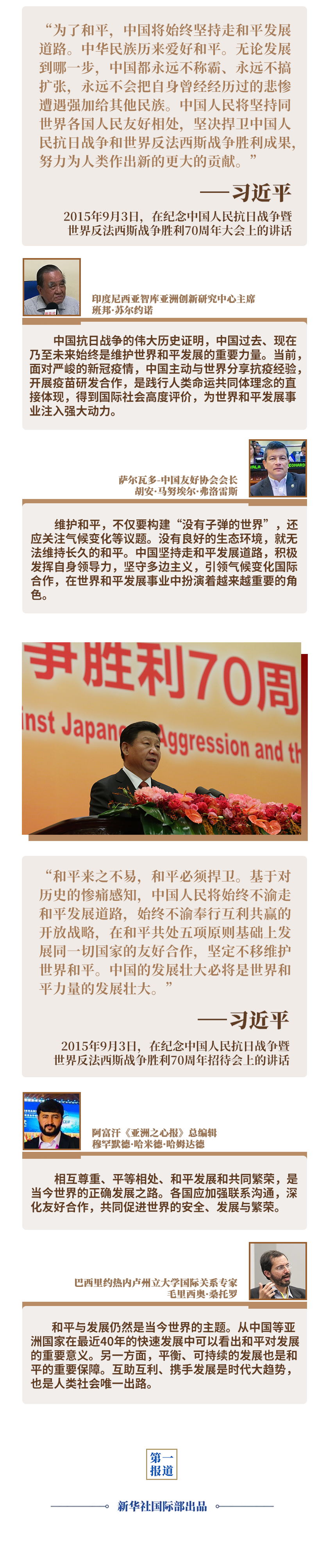 当今世界仍不太平,新冠疫情推动百年变局加速变化,进入动荡变革期的世界亟需明确前行方向。此时,重温5年前习近平主席纪念中国人民抗日战争暨世界反法西斯战争胜利70周年重要讲话中关于和平发展的重要论述,尤其具有现实意义——