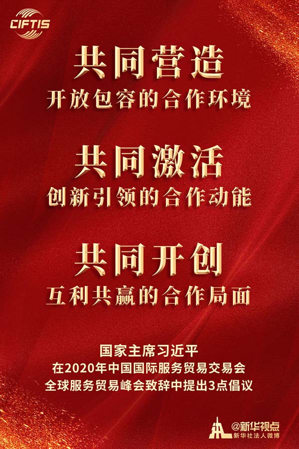 “建立健全跨境服务贸易负面清单管理制度”“继续放宽服务业市场准入”“主动扩大优质服务进口”“加大知识产权保护”“支持组建全球服务贸易联盟”“将支持北京打造国家服务业扩大开放综合示范区”……习近平主席提出深化服务业开放合作的新举措新主张,赋予中国对外开放新内涵,也为全球共同发展注入新动力。