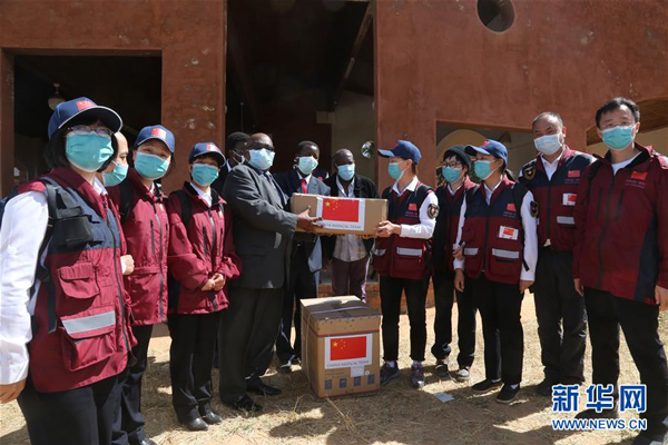 在津巴布韦中马绍纳兰省的姆武尔维医院,中国抗疫医疗专家组为当地医疗机构捐赠医疗物资(5月19日摄)。新华社记者 张玉亮 摄
