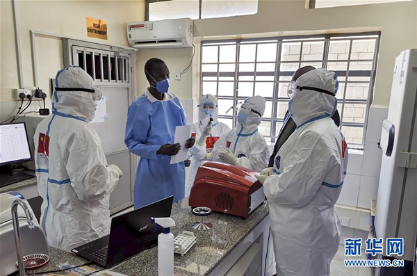 在南苏丹首都朱巴的一处新冠病毒检测机构,中国抗疫医疗专家组成员与南一线医护人员交流(8月21日摄)。新华社发(中国驻南苏丹大使馆供图)