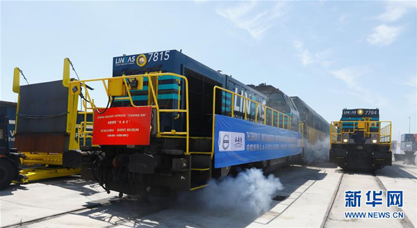 “长安号”中欧班列抵达比利时根特北海港码头(2019年7月4日摄)。新华社记者 潘革平 摄