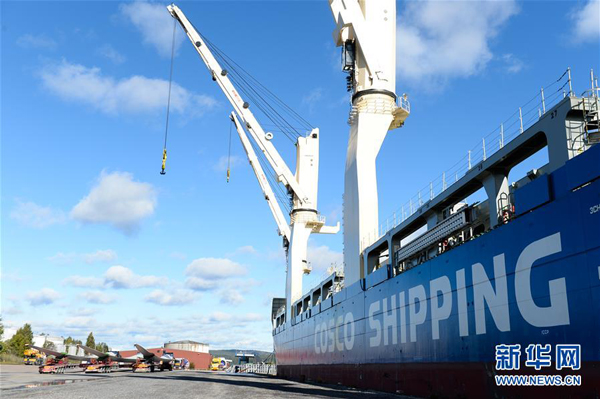 2018年9月15日,中远海运“天恩”轮在瑞典东北部港口城市海讷桑德的码头上进行卸货作业。至此,“天恩”轮首个“冰上丝绸之路”完整航次顺利结束。新华社记者 刘红霞 摄