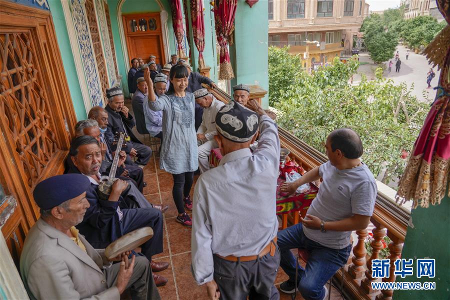 在新疆喀什古城景区的“百年茶馆”,游客和当地茶客边品茶边休闲(5月17日摄)。 新华社记者 赵戈 摄