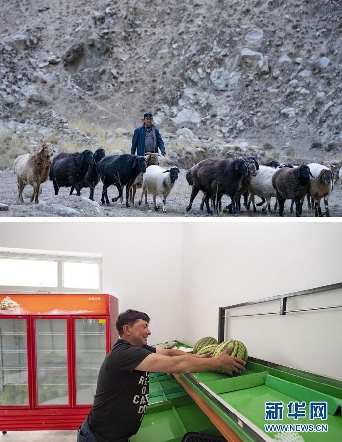 拼版照片。上图:搬迁前,新疆塔什库尔干塔吉克自治县大同乡牧民都热·加尔曼在山谷里放牧(2018年11月16日摄);下图:在塔什库尔干塔吉克自治县塔提库力易地扶贫搬迁安置点,都热·加尔曼在新开办的商店内摆放准备售卖的西瓜(6月24日摄)。新华社记者 胡虎虎 摄