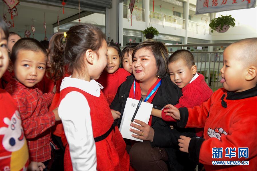 如克亚木·麦提赛地在新疆鄯善县中心幼儿园与孩子们交谈(2019年2月14日摄)。 新华社记者 丁磊 摄