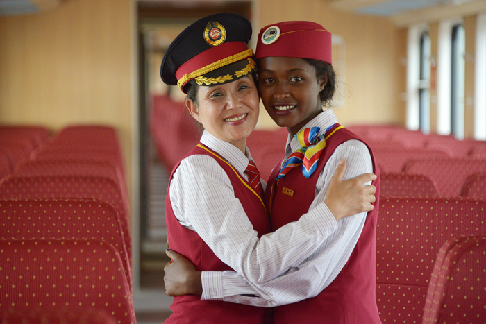 2016年10月1日,在埃塞俄比亚首都亚的斯亚贝巴拉布车站,中方列车长丁继华(左)和埃塞俄比亚乘务员沃克内什·贝特鲁拥抱。新华社记者孙瑞博摄