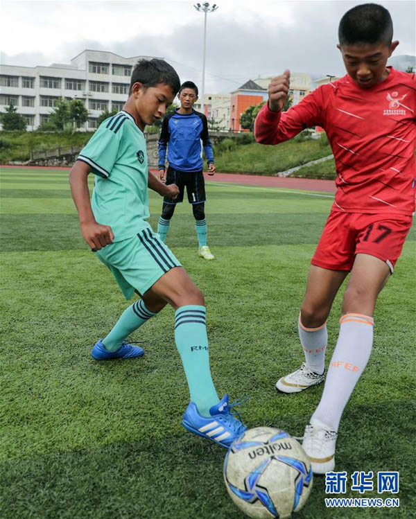 在四川省昭觉县拉莫足球场,阿作伍勒(左)在训练中拼抢(8月13日摄)。新华社记者沈伯韩摄