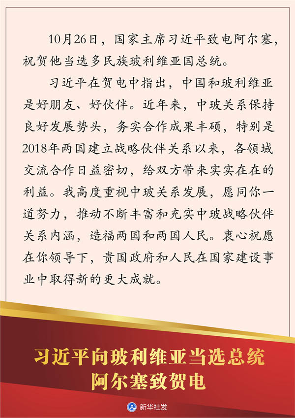 习近平在贺电中指出,中国和玻利维亚是好朋友、好伙伴。近年来,中玻关系保持良好发展势头,务实合作成果丰硕,特别是2018年两国建立战略伙伴关系以来,各领域交流合作日益密切,给双方带来实实在在的利益。我高度重视中玻关系发展,愿同你一道努力,推动不断丰富和充实中玻战略伙伴关系内涵,造福两国和两国人民。衷心祝愿在你领导下,贵国政府和人民在国家建设事业中取得新的更大成就。