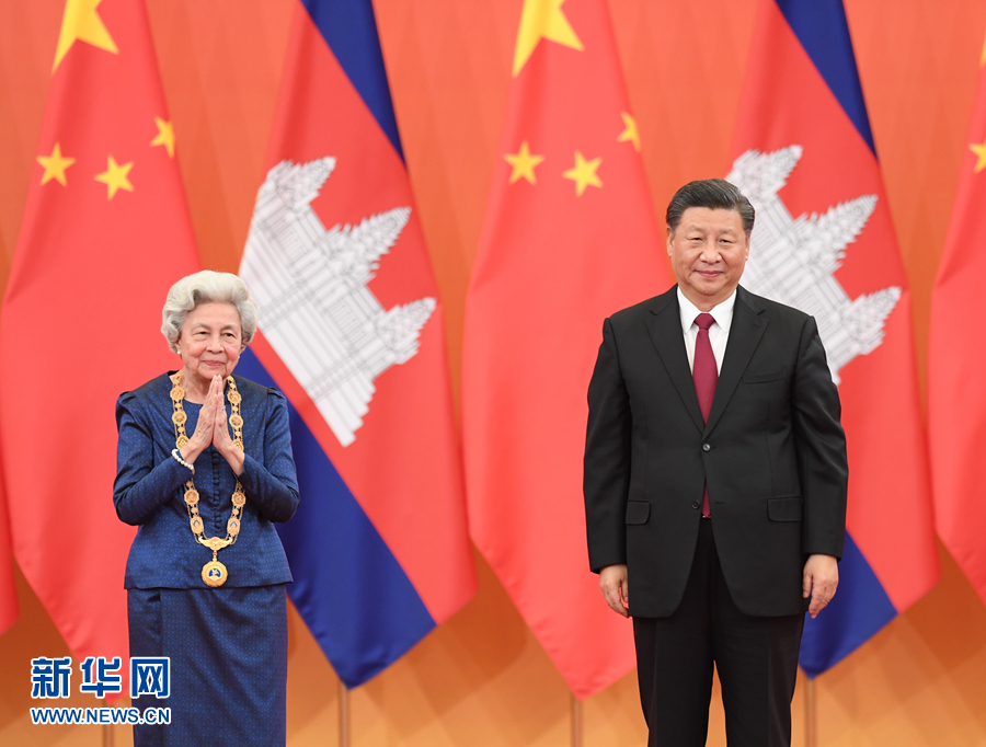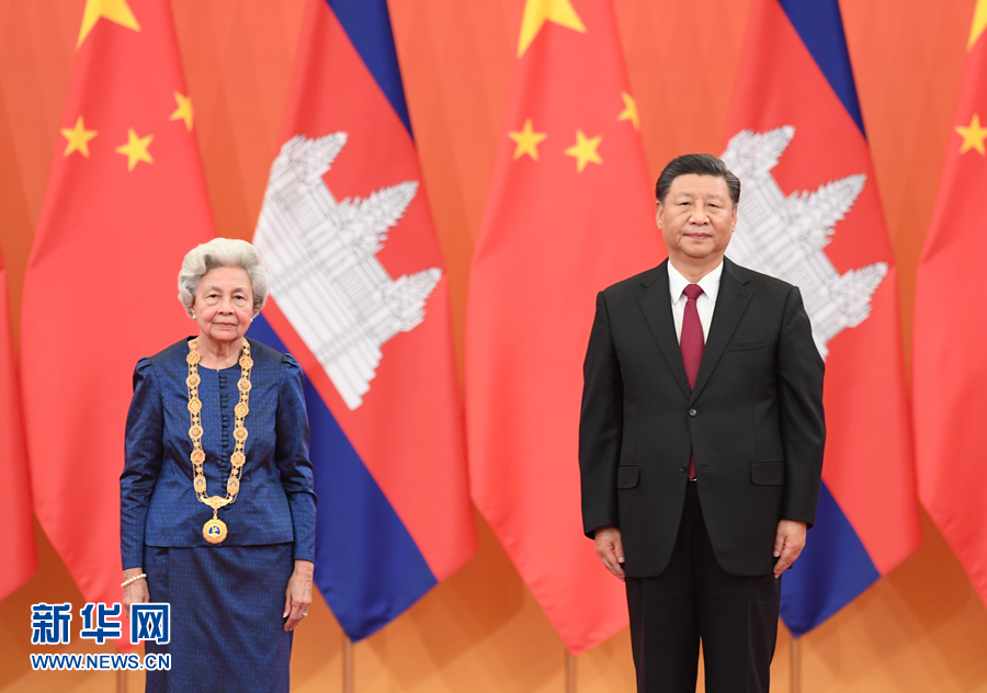11月6日,国家主席习近平在北京人民大会堂为柬埔寨太后莫尼列举行中华人民共和国“友谊勋章”颁授仪式。 新华社记者 张领 摄