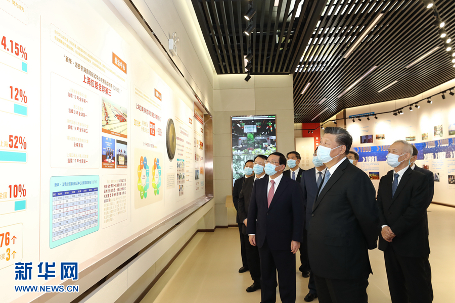11月12日,浦东开发开放30周年庆祝大会在上海市举行。中共中央总书记、国家主席、中央军委主席习近平在会上发表重要讲话。这是当天上午,习近平等参观“在国家战略的引领下——浦东开发开放30周年主题展”。 新华社记者 鞠鹏 摄