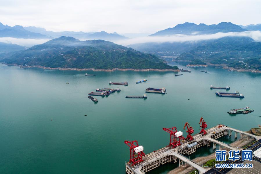 船舶行驶在湖北省宜昌市秭归县三峡翻坝物流园一带水域(4月20日摄,无人机照片)。新华社发(王罡 摄)