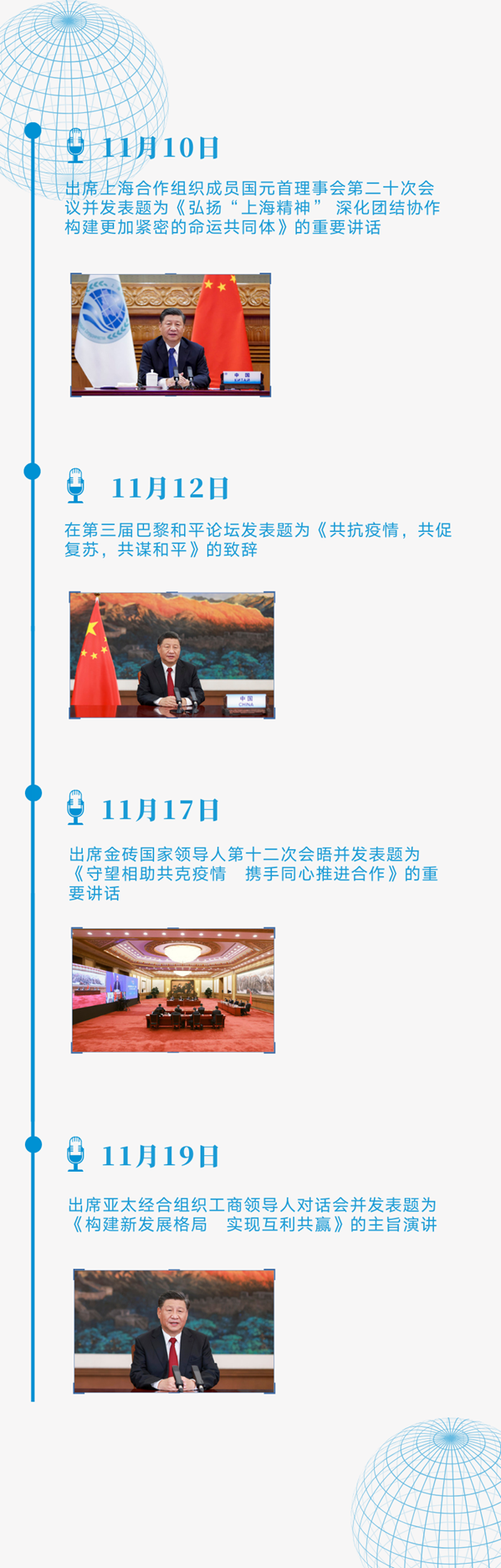 11月10日至22日,不到两周时间,习主席以视频方式出席4场多边会议、一场国际论坛,发表8场重要讲话、主旨演讲和致辞,外交日程异常密集。