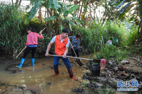 2020年5月2日,广西兴业县小平山镇金华村驻村第一书记董积有(左二)与村民一起清理河道中的淤泥和垃圾。新华社记者 曹祎铭 摄
