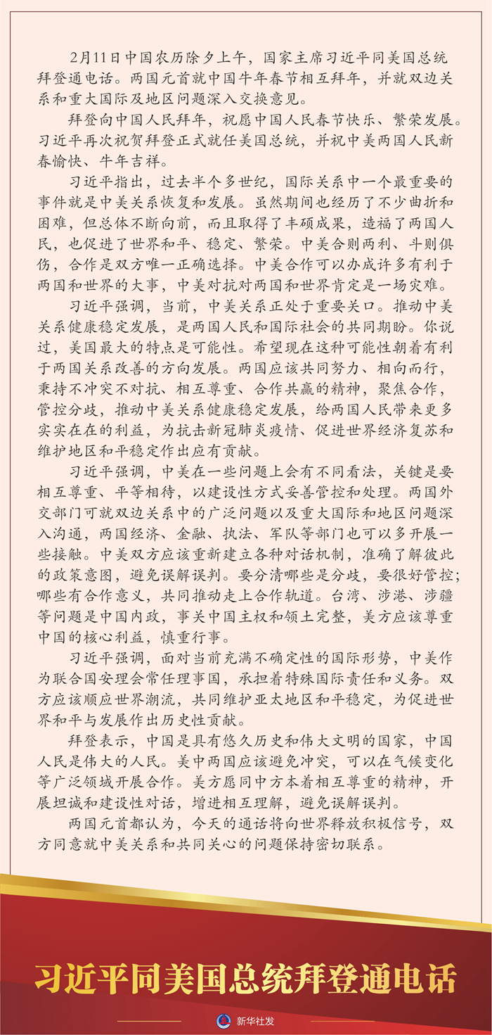 拜登向中国人民拜年,祝愿中国人民春节快乐、繁荣发展。习近平再次祝贺拜登正式就任美国总统,并祝中美两国人民新春愉快、牛年吉祥。