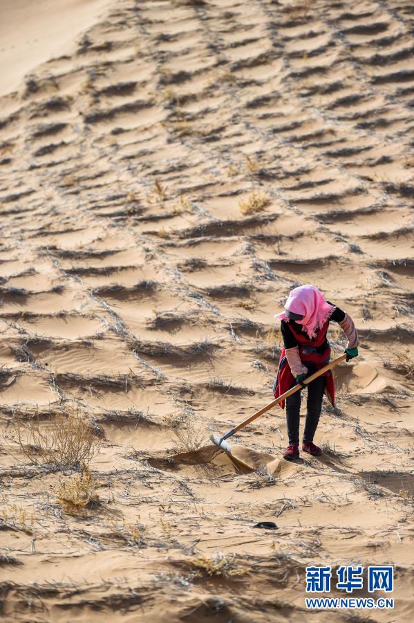 2020年4月2日,工人在阿拉善左旗腾格里沙漠种植花棒。新华社记者 连振 摄