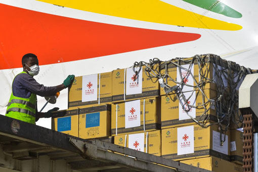 3月30日,工作人员在埃塞俄比亚亚的斯亚贝巴博莱国际机场卸载中国政府援助的疫苗。