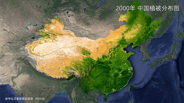 通过卫星遥感数据生成的2000年和2020年中国植被分布情况,可以看到内蒙古东部、中部边界的植被区明显扩张。四川、贵州、湖南、湖北、河南、山东等省份植被密度、长势状况喜人。