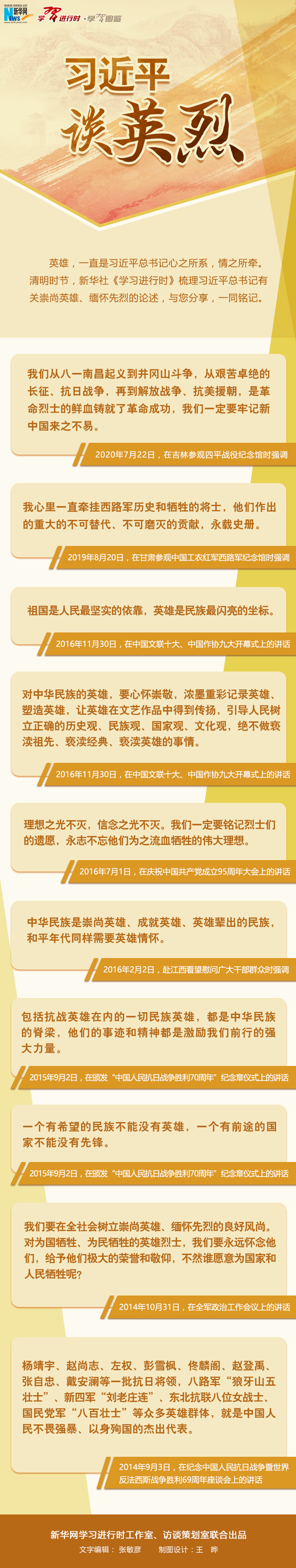 【学习进行时】“天地英雄气,千秋尚凛然。”习近平总书记曾在多个场合缅怀英烈,讲述英雄事迹、致敬英雄精神;他号召全社会要崇尚英雄、学习英雄、关爱英雄。清明时节,新华社《学习进行时》原创品牌栏目“讲习所”推出文章,与您一起感知习近平的英雄情怀。