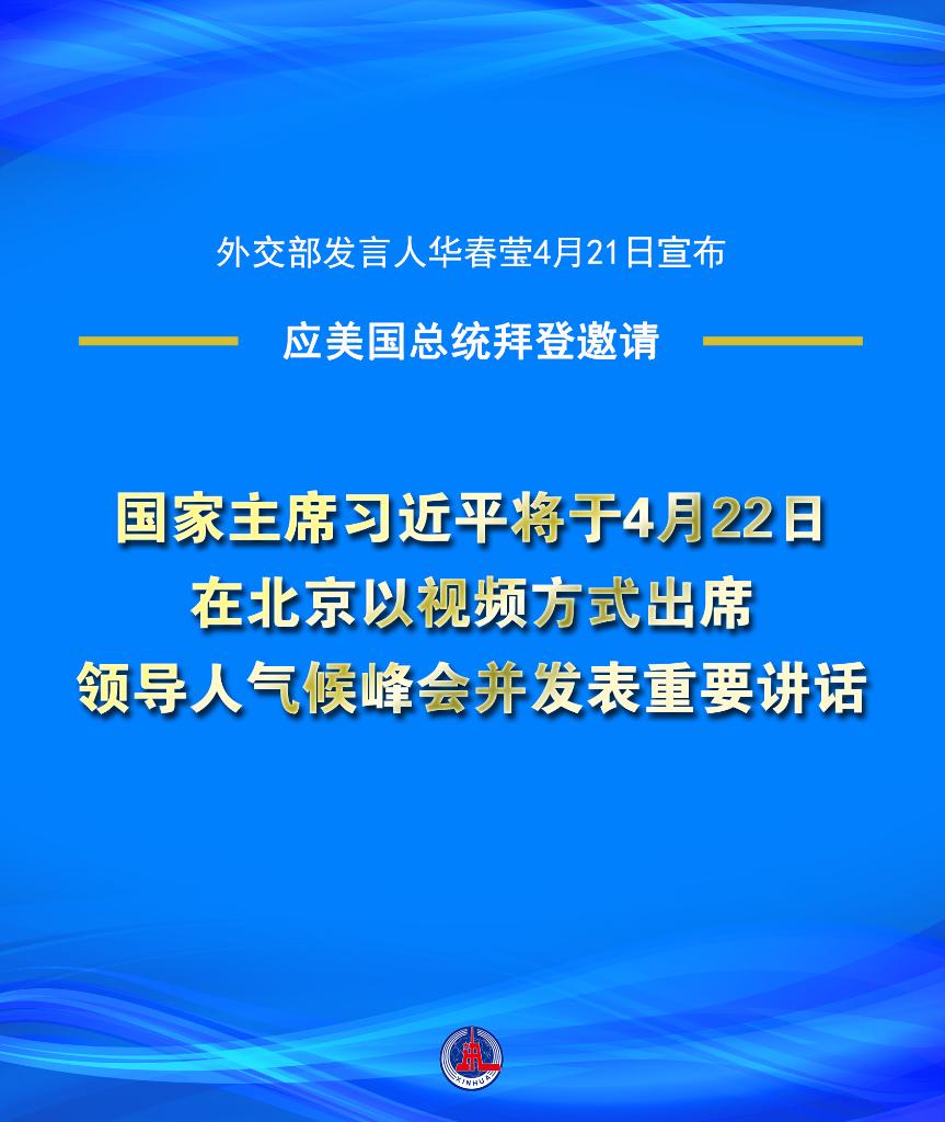 外交部发言人华春莹21日宣布:应美国总统拜登邀请,国家主席习近平将于4月22日在北京以视频方式出席领导人气候峰会并发表重要讲话。
