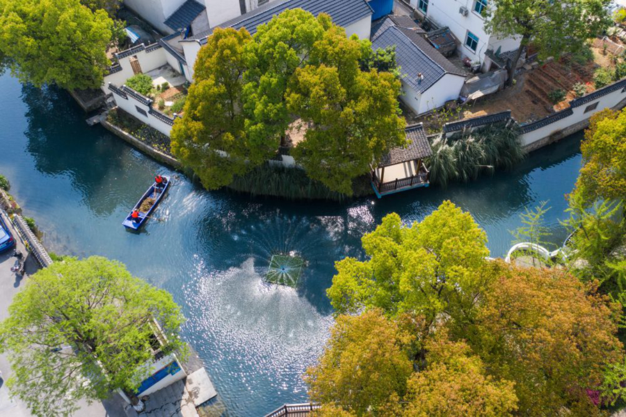浙江省长兴县龙山街道渚山村,保洁人员进行日常河道护理巡查(2020年4月9日摄,无人机照片)。新华社记者 徐昱 摄