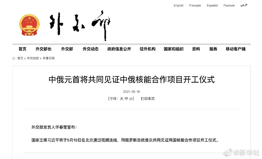 外交部发言人华春莹5月18日宣布:国家主席习近平将于5月19日在北京通过视频连线,同俄罗斯总统普京共同见证两国核能合作项目开工仪式。