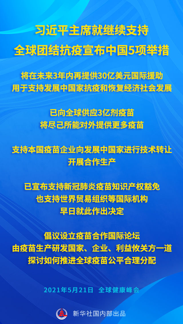 2021年5月,面对全球疫情的起伏反复,着眼全人类共同需求,习近平主席在全球健康峰会上又提出5点意见、宣布5项新举措。