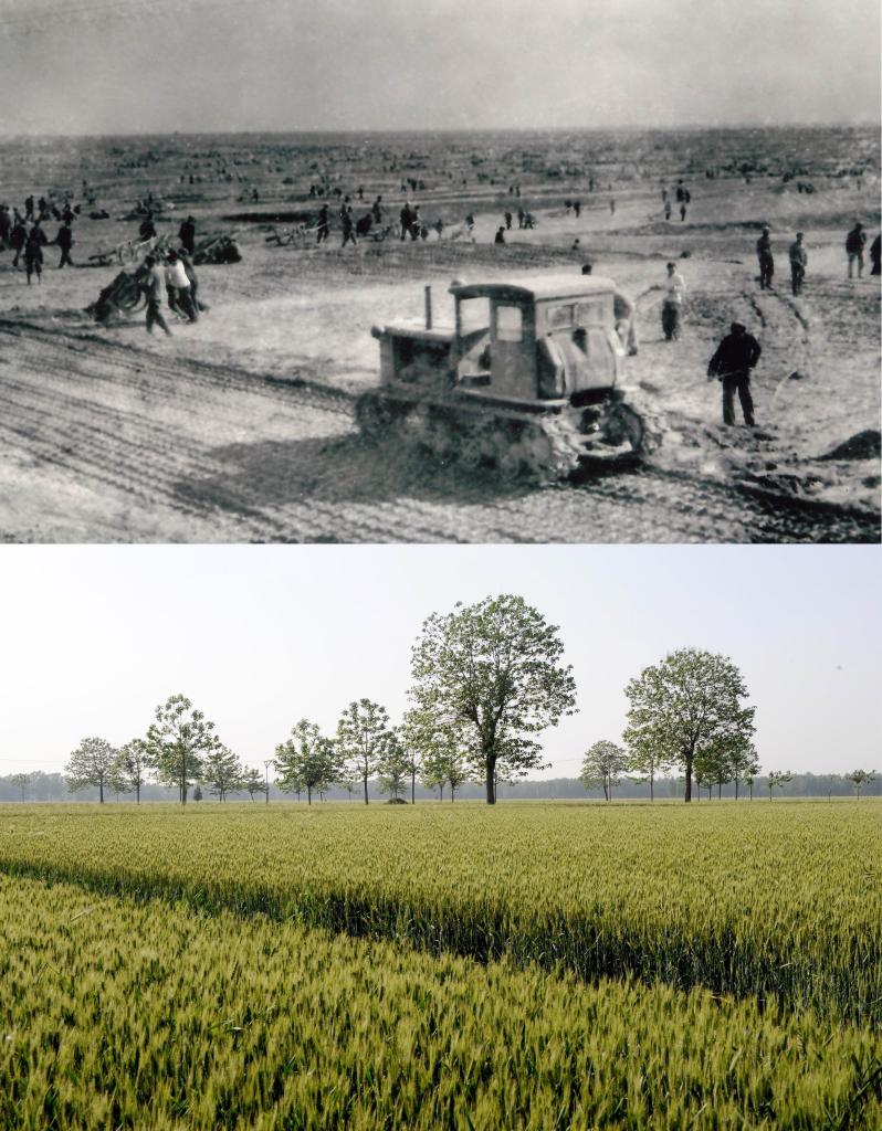 拼版照片:上图为20世纪60年代河南省兰考县改造盐碱地的情形(资料照片);下图为兰考县堌阳镇的一片麦田(2014年5月5日新华社记者朱祥摄)。新华社发