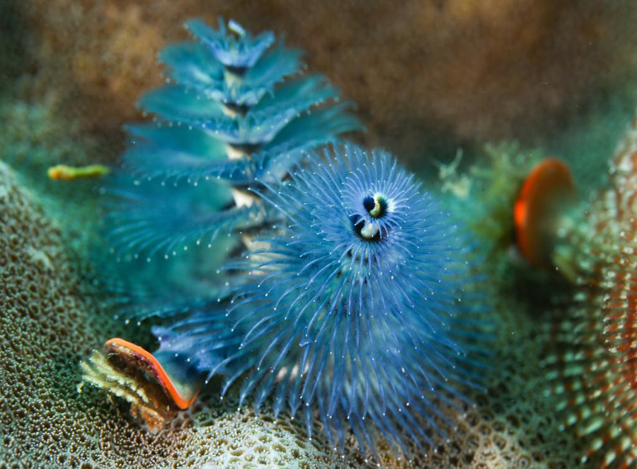 这是海南三亚蜈支洲岛海域海洋牧场中的圣诞树管虫(2021年5月23日摄)。新华社记者 杨冠宇 摄