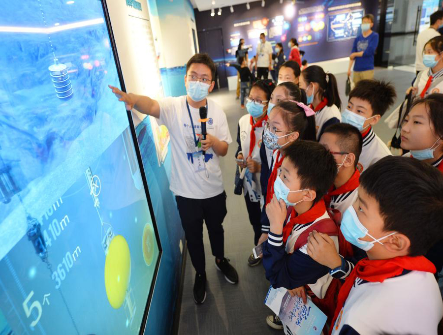 2021年5月22日,中科院海洋研究所科研人员为学生们科普海洋科考船下潜采集标本的相关知识。新华社发(王海滨 摄)