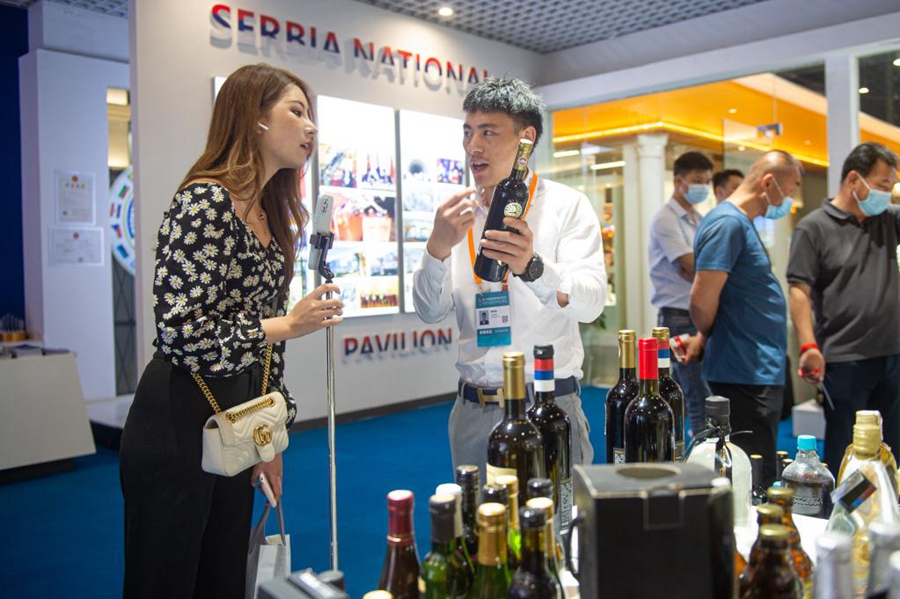 6月8日,第二届中国—中东欧国家博览会开幕,展商通过直播推介来自塞尔维亚的酒类商品。新华社记者 江汉 摄