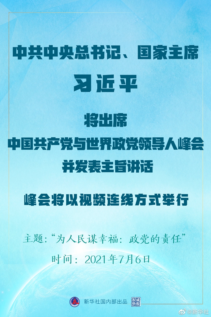 中共中央对外联络部发言人胡兆明5日宣布,中国共产党与世界政党领导人峰会将于7月6日以视频连线方式举行,中共中央总书记、国家主席习近平将在北京出席会议并发表主旨讲话。此次会议的主题为“为人民谋幸福:政党的责任”,160多个国家的500多位政党和政治组织等领导人以及逾万名政党代表等将出席会议。