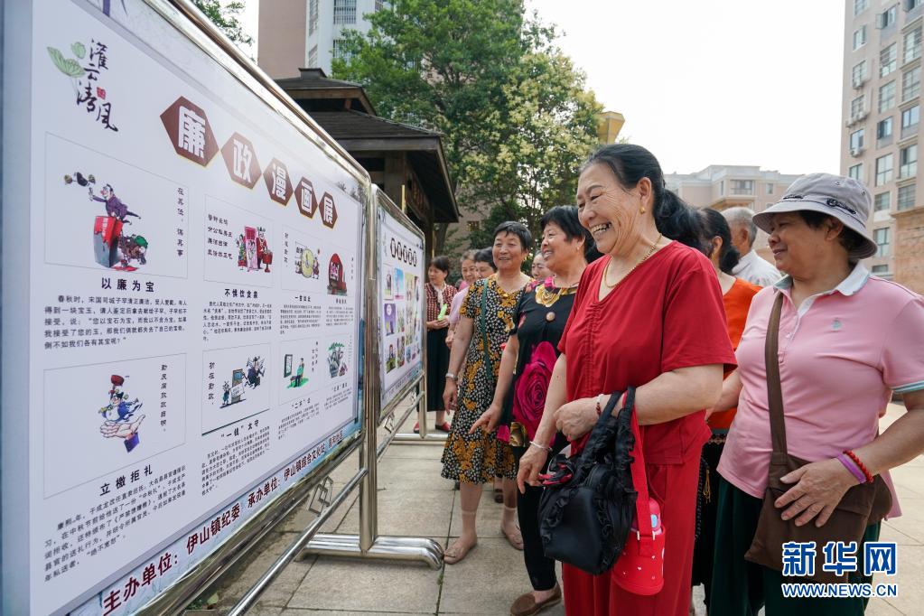 6月23日,在江苏省连云港市灌云县昌和社区“廉政文化进社区”活动现场,社区居民在参观廉政漫画展。新华社记者李博 摄