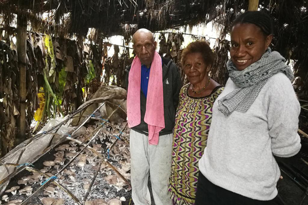 2019年9月9日,在巴布亚新几内亚东高地省鲁法地区,科皮·马诺韦(左1)和女儿普里西利娅(右1)在家中的菌草菇棚里合影。