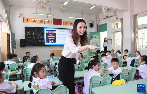 深圳市福田区南园小学教师、香港理工大学对外汉语教育专业硕士毕业的香港青年黄晓蕾在英语课上与孩子们互动(9月1日摄)。新华社记者 毛思倩 摄