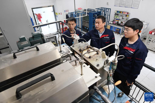 福建闽江学院服装与艺术工程学院教授李永贵(中)在“福建省新型功能性纺织纤维及材料重点实验室”教学生做纺丝实验(3月22日摄)。新华社记者 林善传 摄