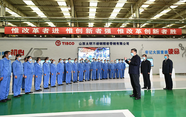 △2020年5月12日,习近平在山西太钢不锈钢精密带钢有限公司同企业职工亲切交流。